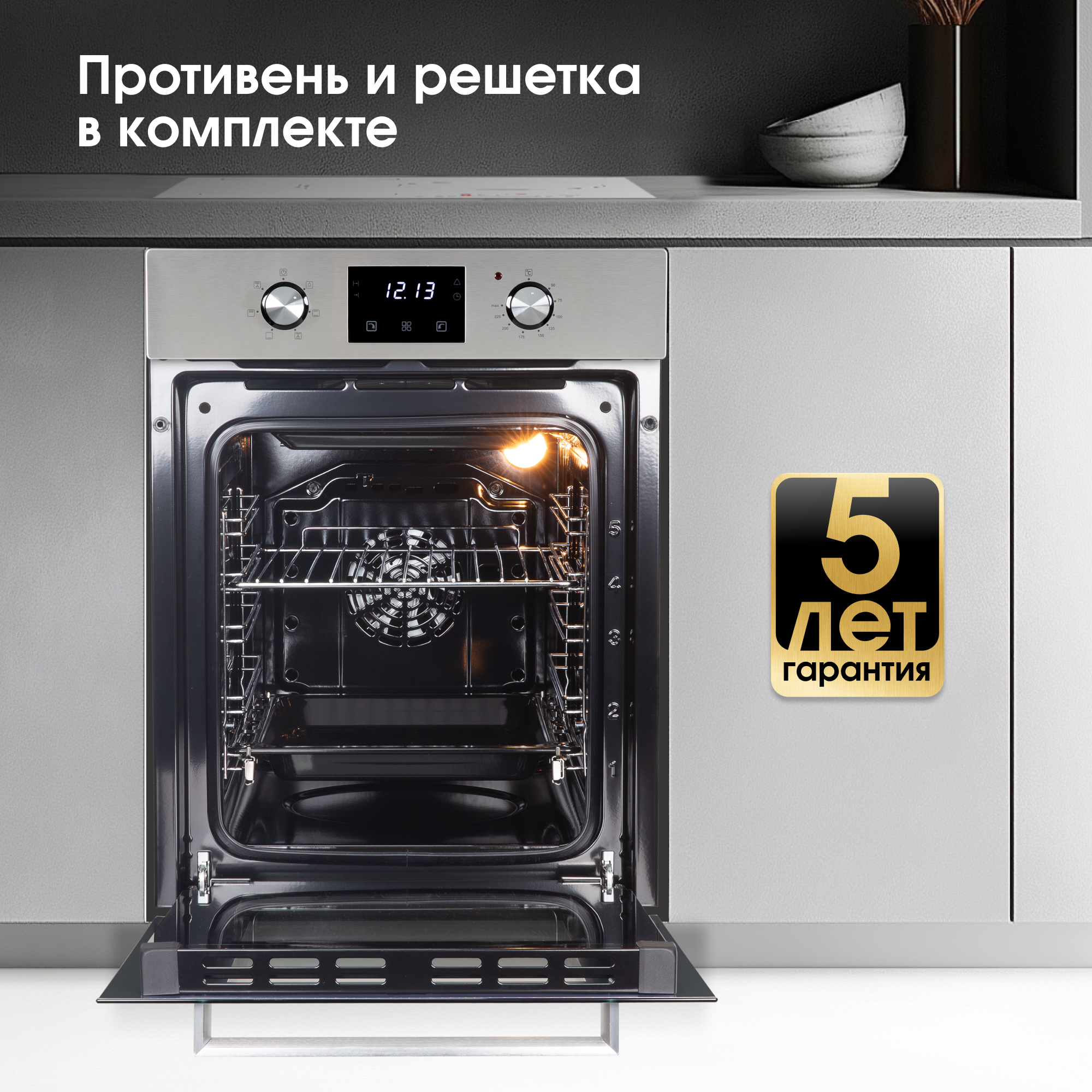 Объем камеры в 51 л с 5 уровнями установки противеня на хромированных боковых направляющих позволит приготовить блюда любых размеров: запечь курицу целиком или испечь пирог на большую семью. В комплекте есть противень и съемная решетка.