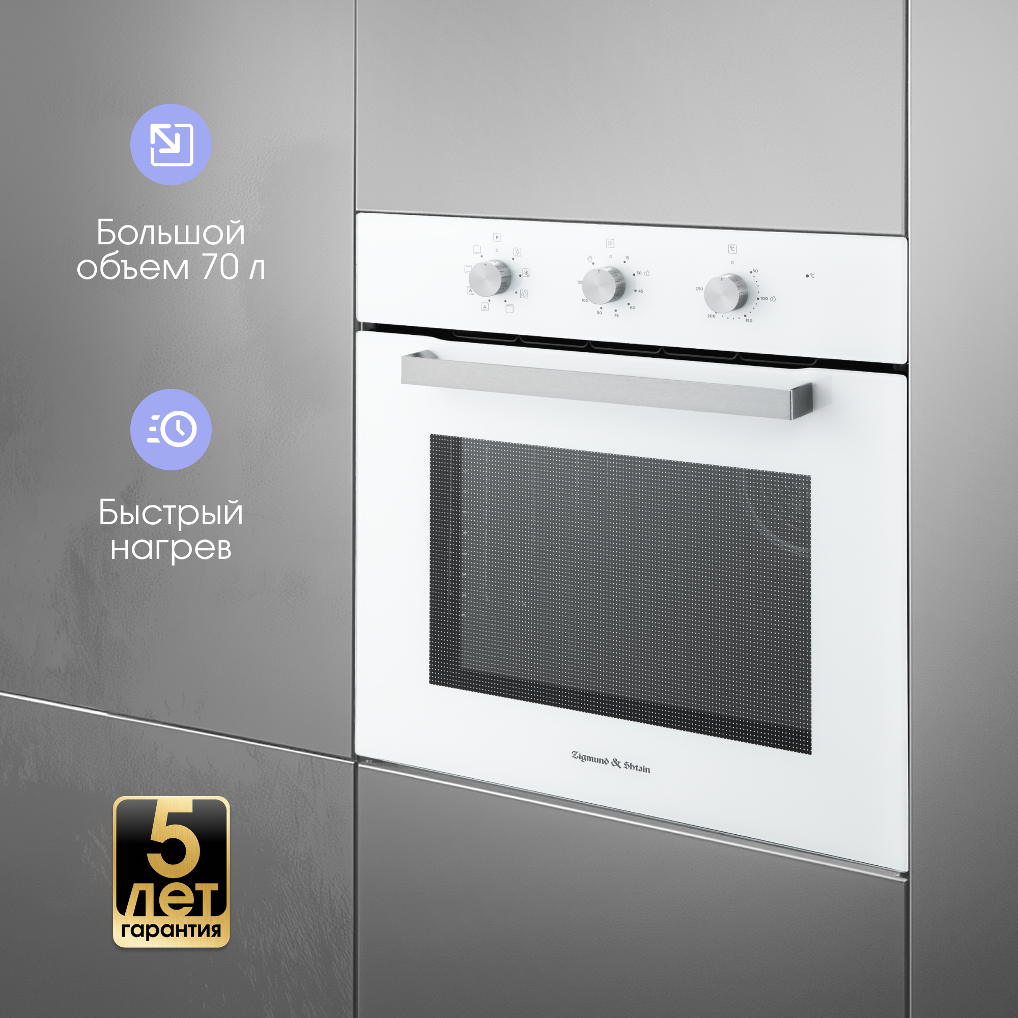 Объем камеры в 70 л с 5 уровнями установки противня на съемных металлических направляющих позволит приготовить блюда любых размеров: запечь курицу целиком или испечь пирог на большую семью, не потратив на это много времени благодаря быстрому нагреву.