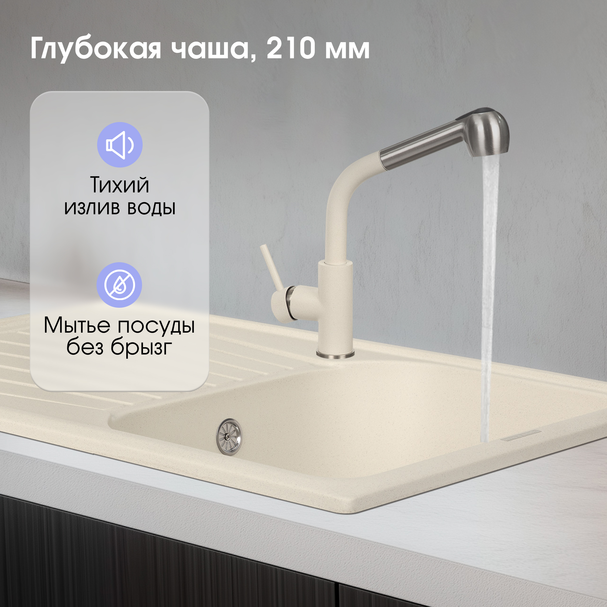 Просторная чаша и обширное крыло – вот основные преимущества гранитной мойки KLASSISCH 790. Ее габаритные размеры – 790*500 мм., при чаше глубиной в 19см. Классический вариант, не имеющий ничего лишнего. Чаша занимает примерно половину всей ширины раковины, а крыло свободно пристыковывается к поверхности столешницы. Если они имеют одинаковую фактуру и цвет, то не сразу можно разобрать, где кончается мойка и начинается рабочая часть стола, особенно если добавить к этому гармонично вписывающуюся в границы любой столешницы прямоугольную форму. Материал мойки – гранит. Специфические свойства поверхности придают раковине особую прочность и инертность к воздействию химических веществ различного происхождения.
