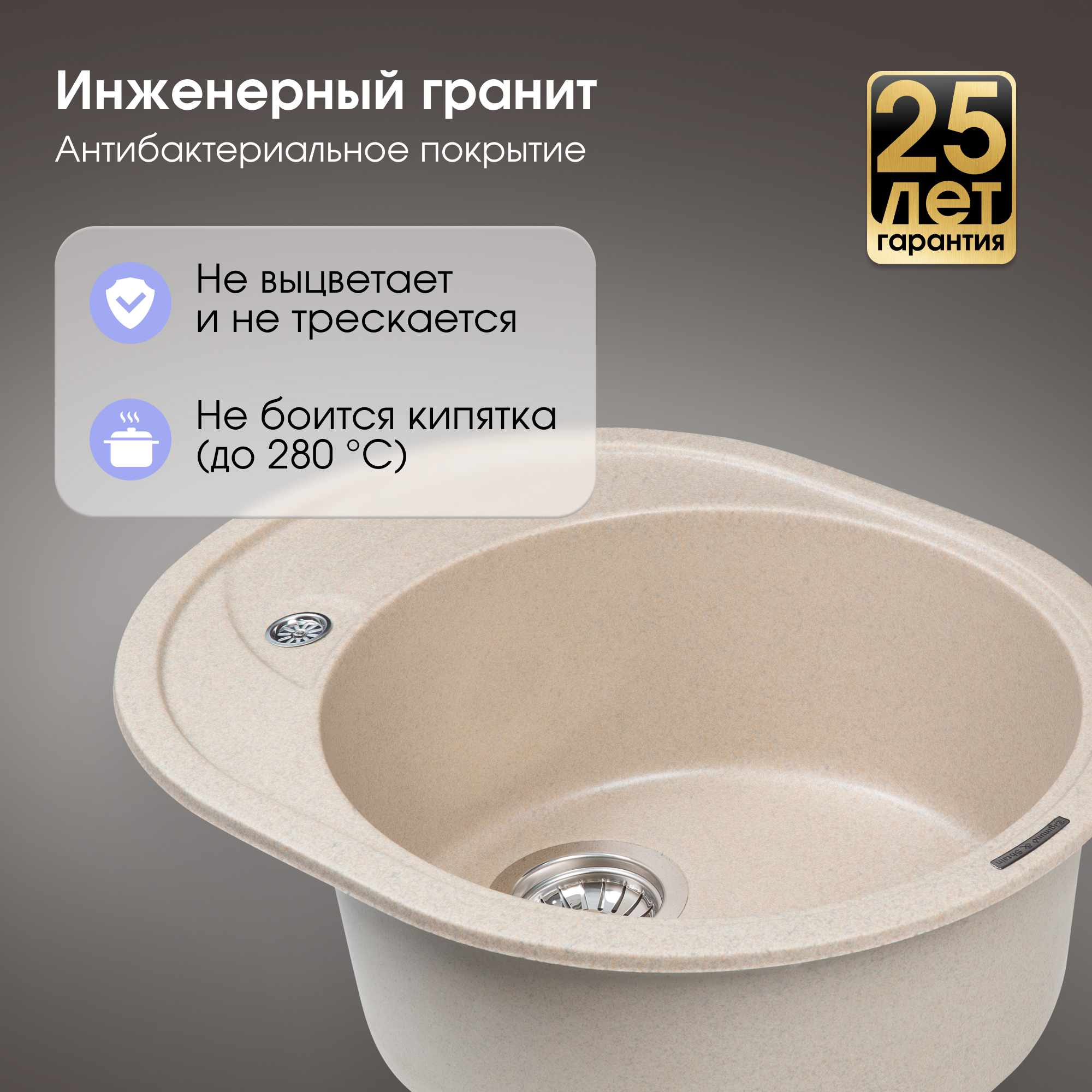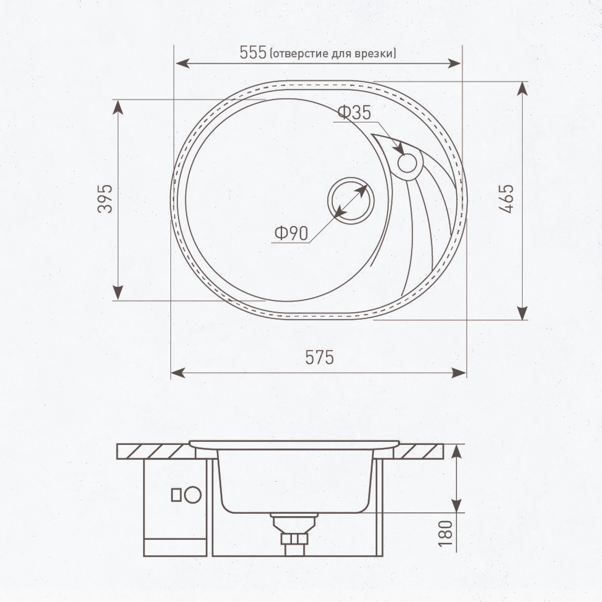 Овальная форма гранитной мойки KREIS OV 575 не оставит равнодушным человека стремящегося к комфорту. Впрочем. также как и дополнительное оснащение гранитным крылом, которое можно повернуть как вправо, так и влево, на выбор пользователя. Это дает неоспоримое удобство при определении места и позиции расположения мойки на кухне. Если с одной стороны стена, холодильник или любое другое препятствие, можно повернуть её в противоположную от него сторону. В крыле мойки предусмотрен слив, который дает возможность сушить на его поверхности мелкую посуду, или столовые приборы. Для дополнительного удобства отверстия под смеситель намечены с двух сторон мойки (снизу и сверху). Крепежная арматура немецкого завода Hettich поставляемая в комплекте с мойкой, обеспечит надежное крепление к столешнице на протяжении всего срока службы изделия.