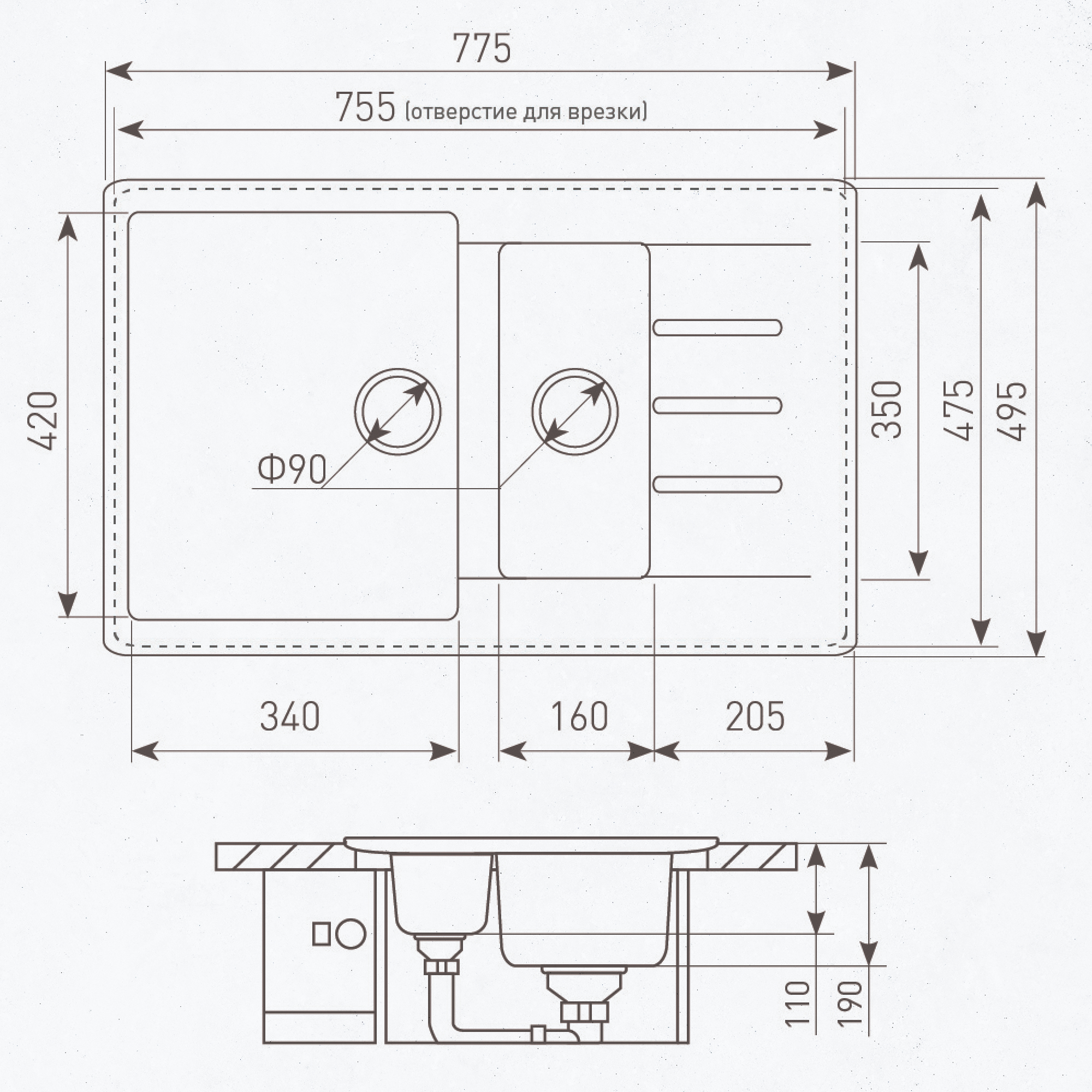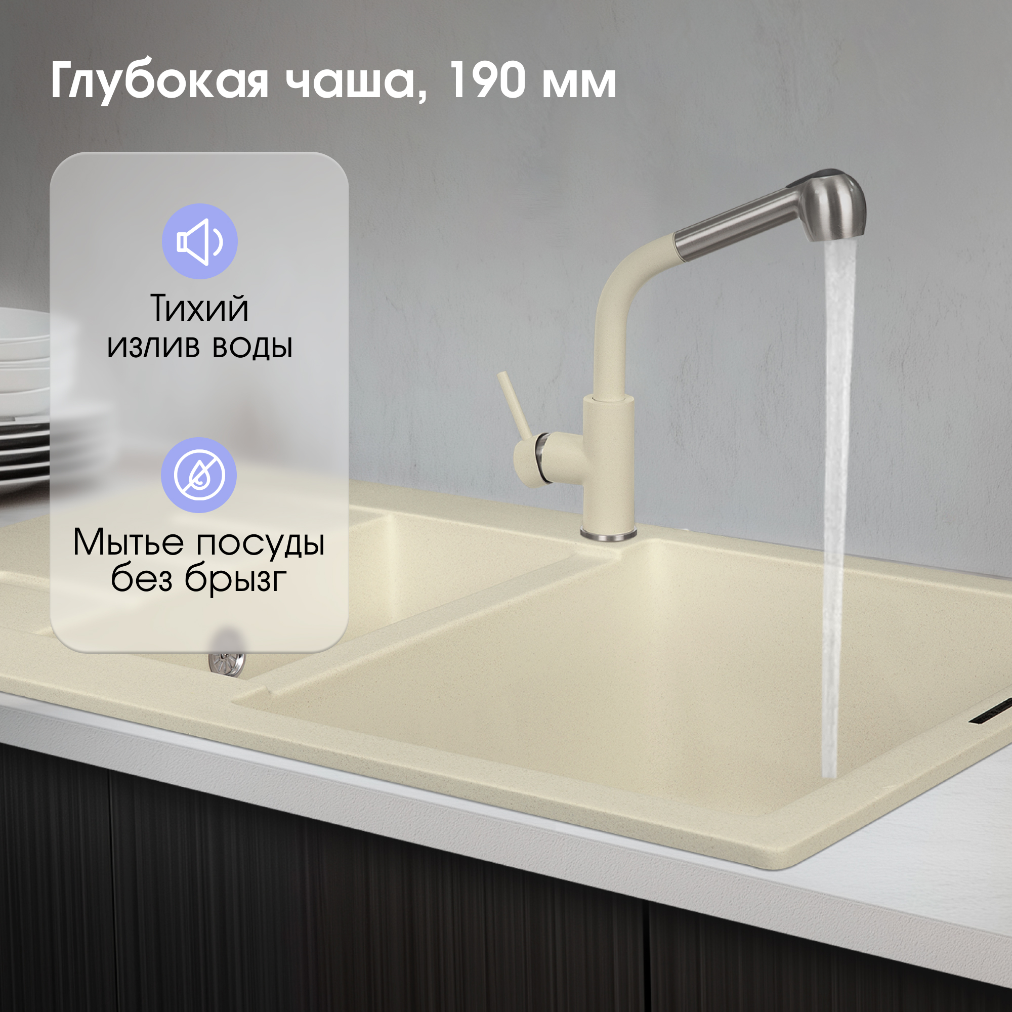 Конструкция вместительной гранитной мойки RECHTECK 775.2 обладает всем, что необходимо иметь под рукой в то время, когда хлопочешь на кухне и постоянно пользуешься раковиной. Обширная основная чаша, дополнительная чаша меньших размеров и большое удобное крыло — о таком моечном центре можно только мечтать! В то время как в одной секции замачивается с моющим средством пригоревшая сковорода, в другой свободно моется посуда. Возникла необходимость вымыть продукты? Одна из чаш будет свободна. Мойка сэкономит и воду, и время, затраченное на приготовление блюд. Совсем не обязательно обе чаши должны быть одинакового размера. Гораздо удобнее иметь мойку, когда одна секция меньше другой — это позволит сэкономить место на кухне не в ущерб функциональности устройства. Материалом для изготовления мойки служит инженерный гранит, обладающий превосходными эксплуатационными характеристиками: ударопрочностью, износостойкостью, экологической безопасностью и простотой в обслуживании.