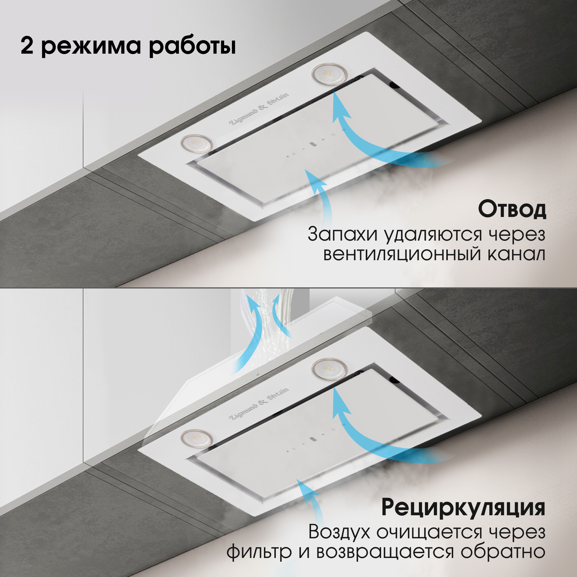 Вытяжка может работать как в режиме отвода, так и рециркуляции, в зависимости от Ваших возможностей и потребностей на кухне. Антивозвратный клапан исключит попадание загрязненного воздуха и постороннего запаха из общего воздуховода на кухню.
