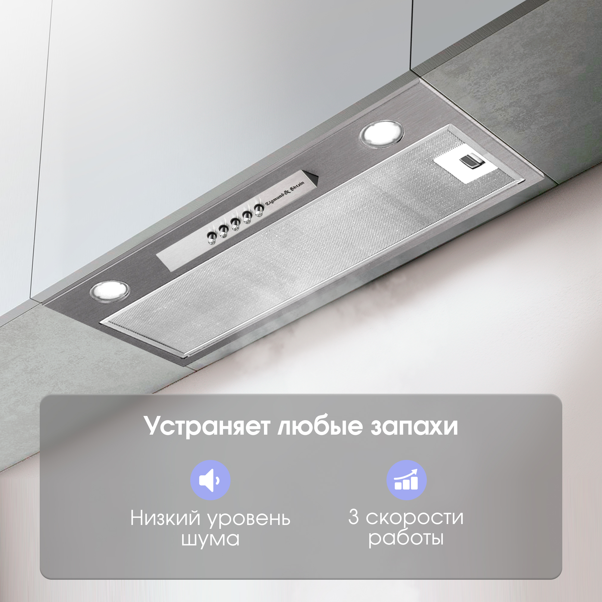 В вытяжке предусмотрено 3 режима скорости, управление которыми осуществляется с помощью аккуратных незаметных кнопок.
