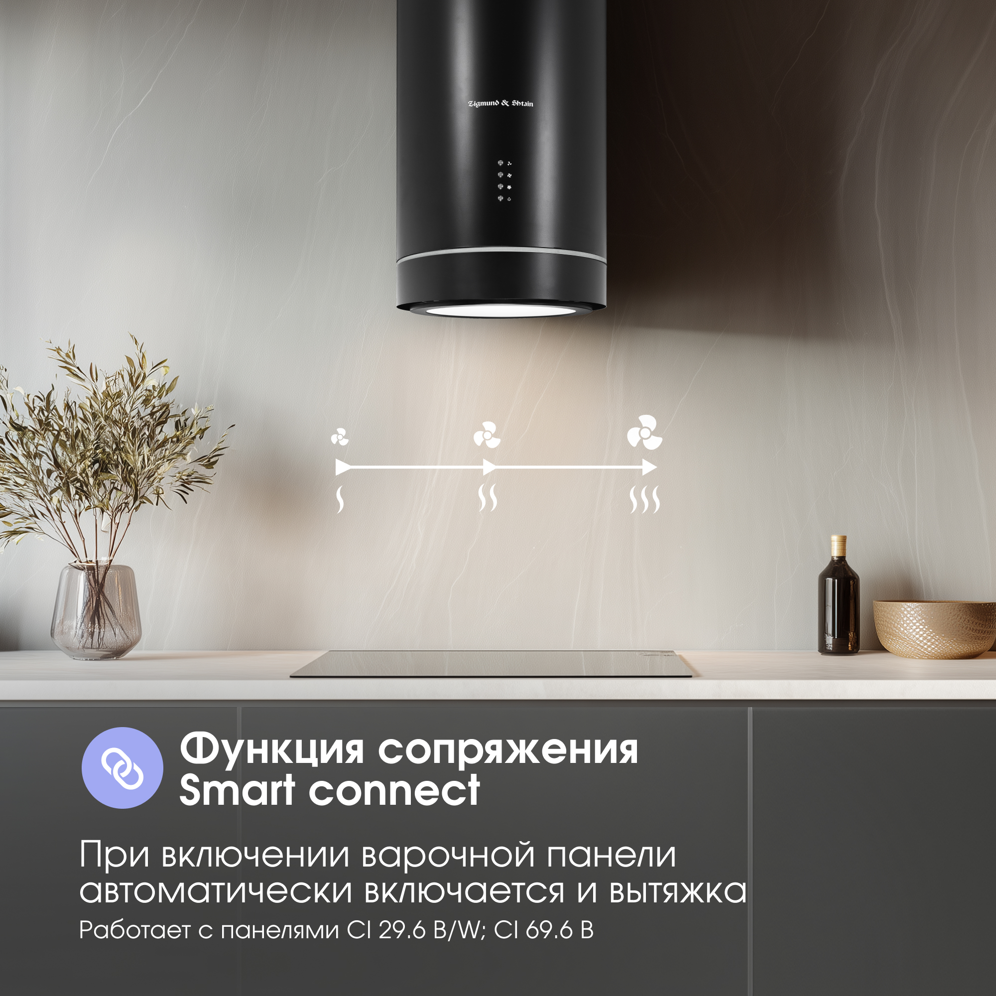 (при включении варочной панели автоматически включается и вытяжка, регулируя скорость работы в зависимости от интенсивности нагрева). Совместима с инверторной индукционной варочной поверхностью CI 29.6