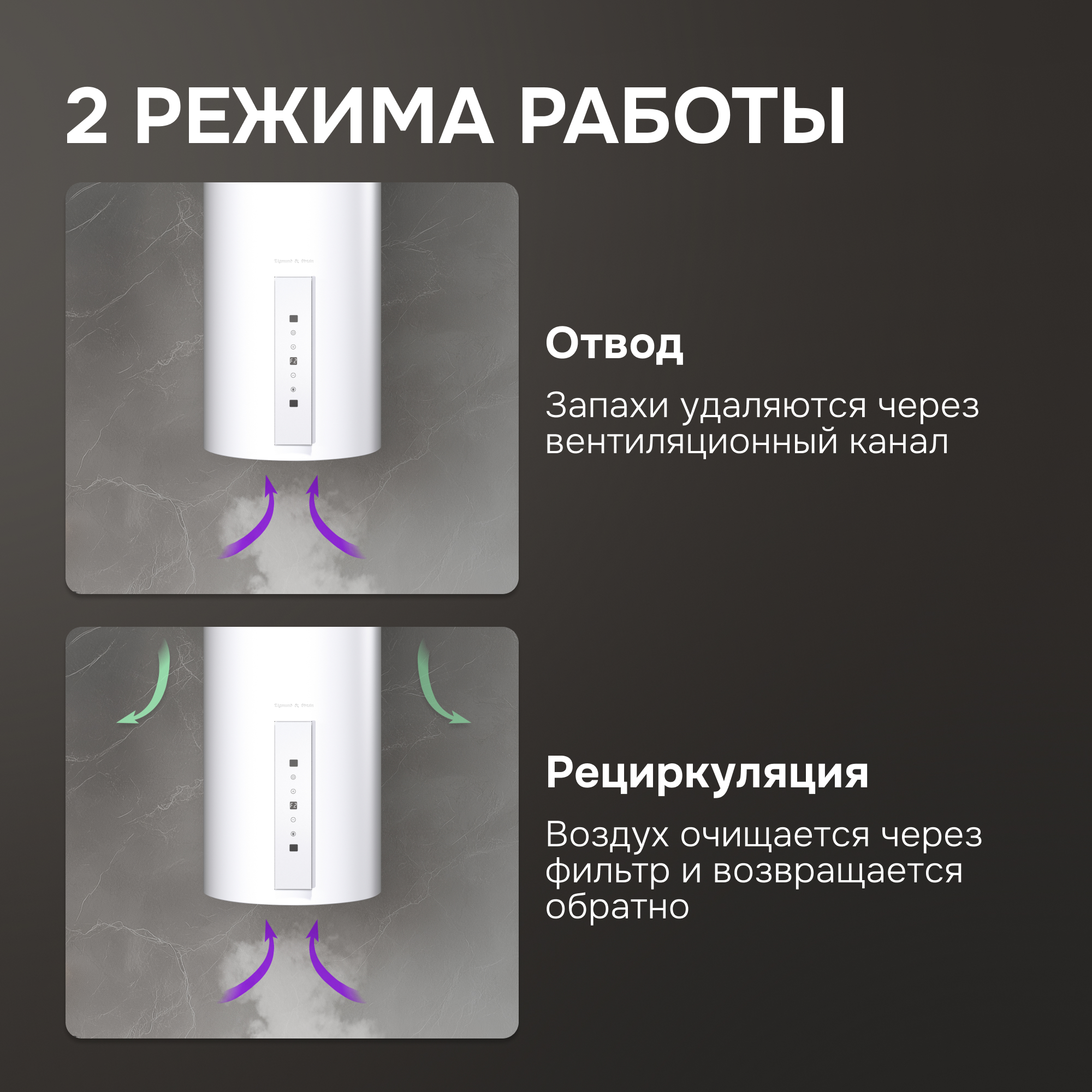 ● Работает как в режиме отвода, так и рециркуляции в зависимости от ваших потребностей.