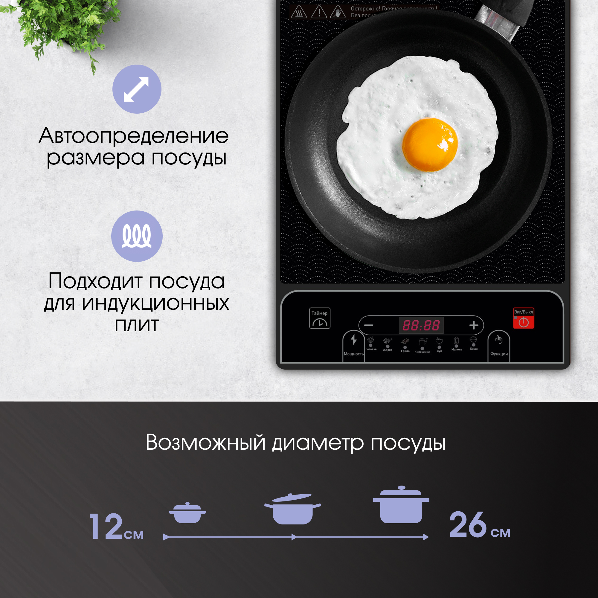 · Панель автоматически реагирует на размер и площадь дна посуды, распределяя мощность нагревания.