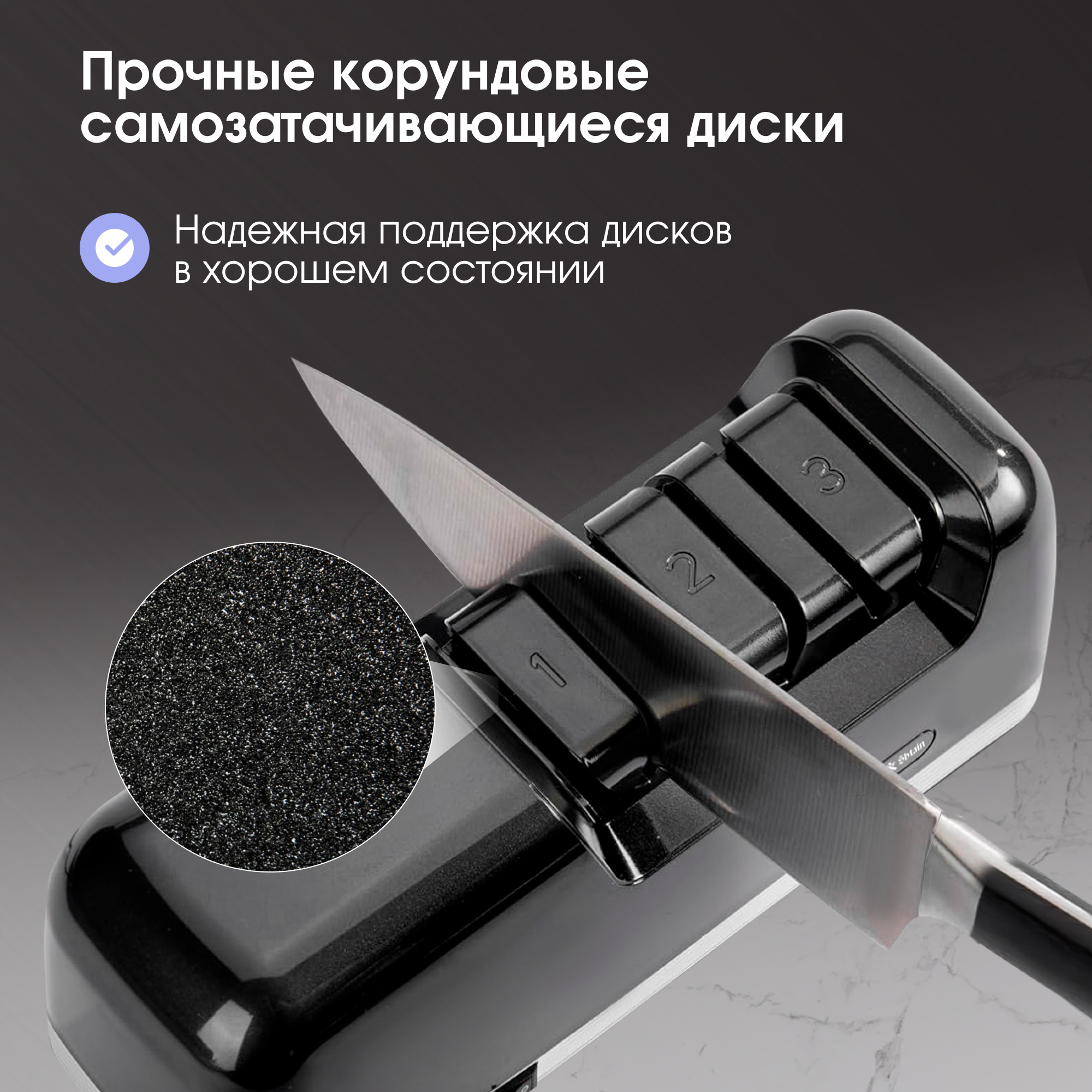 Прибор оснащен 3-мя корундовыми самозатачивающимися дисками, изготовленными из смеси очень твердых синтетических сапфиров на бакелитовой и керамической связке. Бакелитовая связка обеспечивает пониженное теплообразование, эластичность и хорошую самозатачиваемость шлифовального диска, что способствует постоянному поддержанию его в хорошем рабочем состоянии.