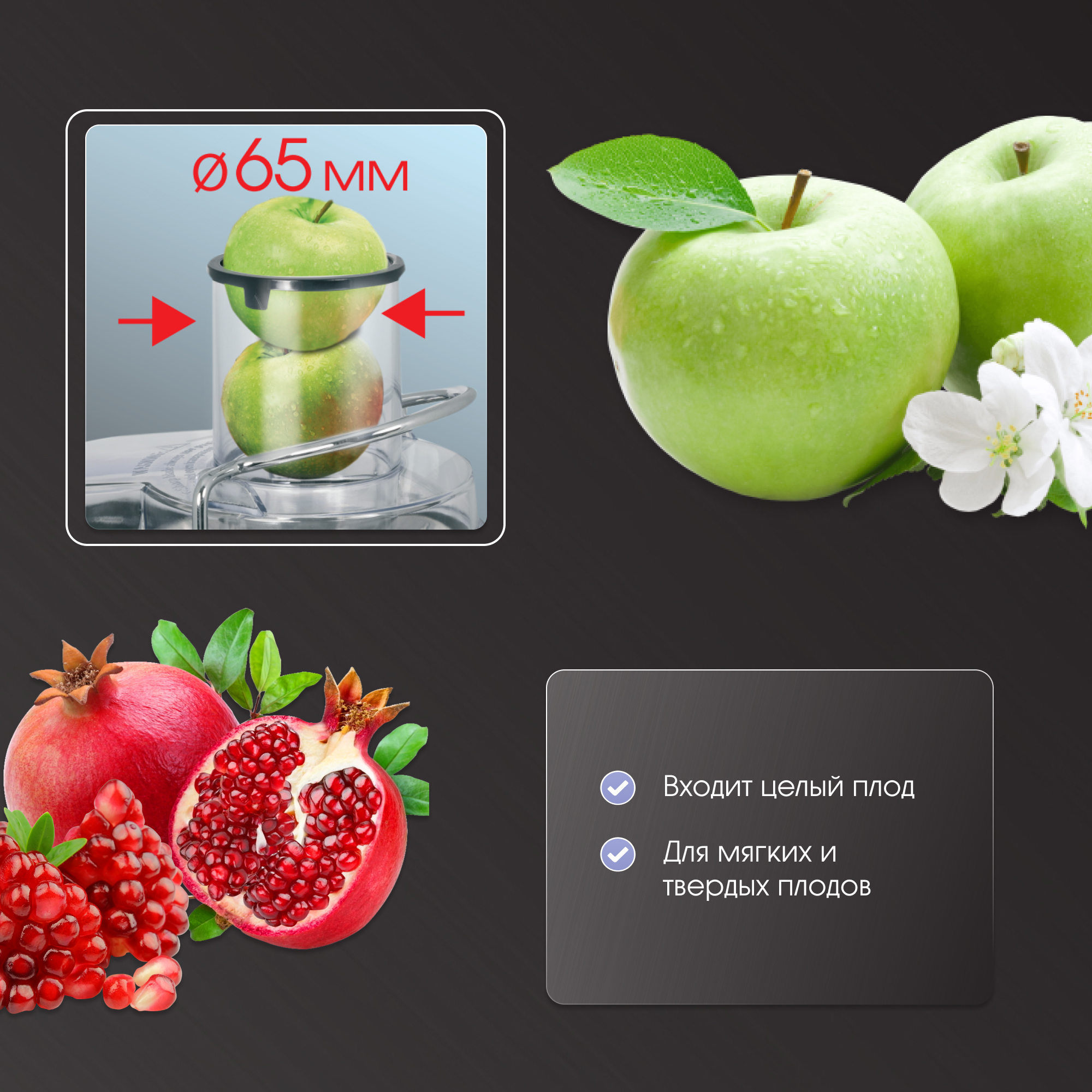 Универсальная помощница может выступать в роли соковыжималки для цитрусовых, подходит для овощей, ягод, твёрдых фруктов.