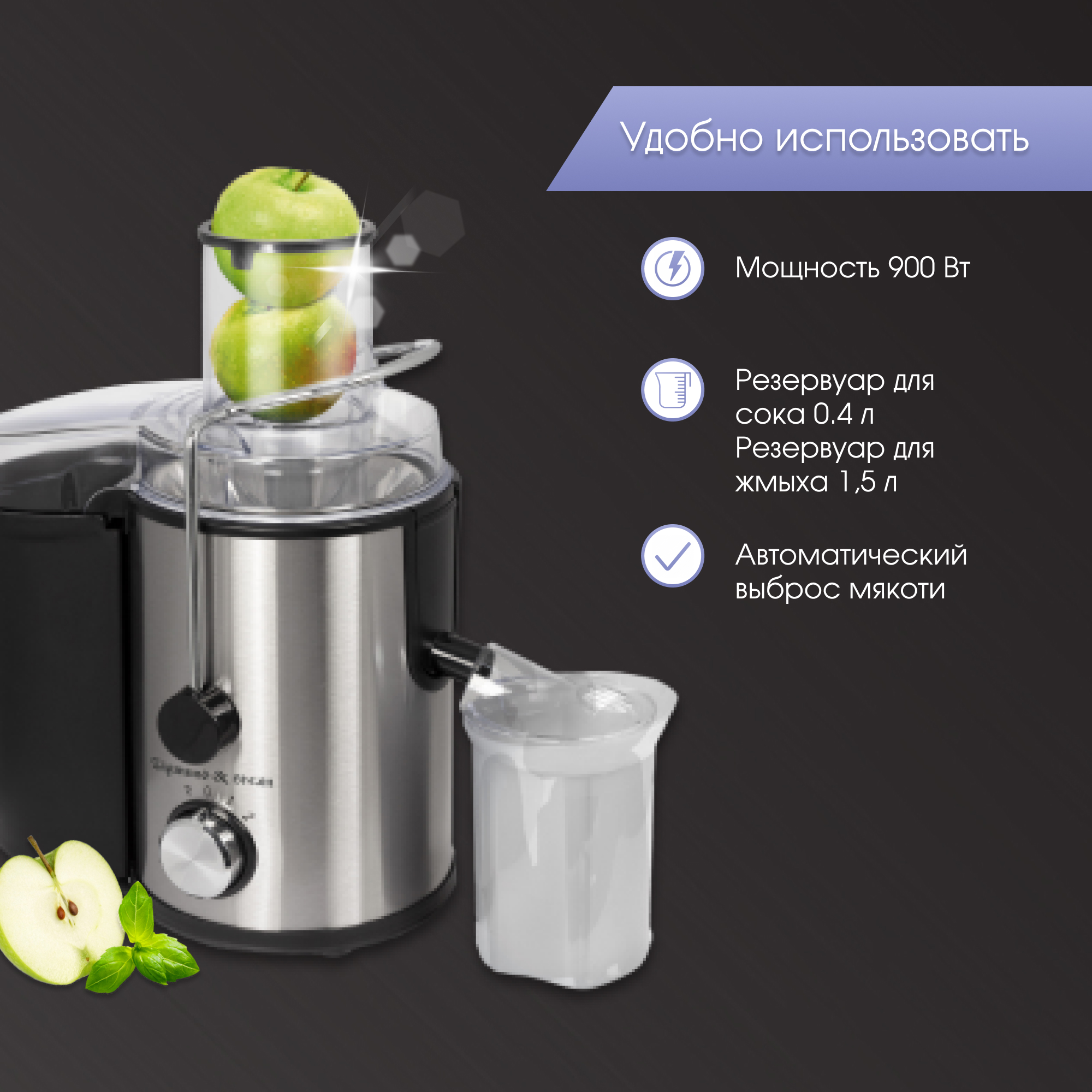 Данная модель обеспечит чистый сок без мякоти в съемную ёмкость объемом 0,4 л.