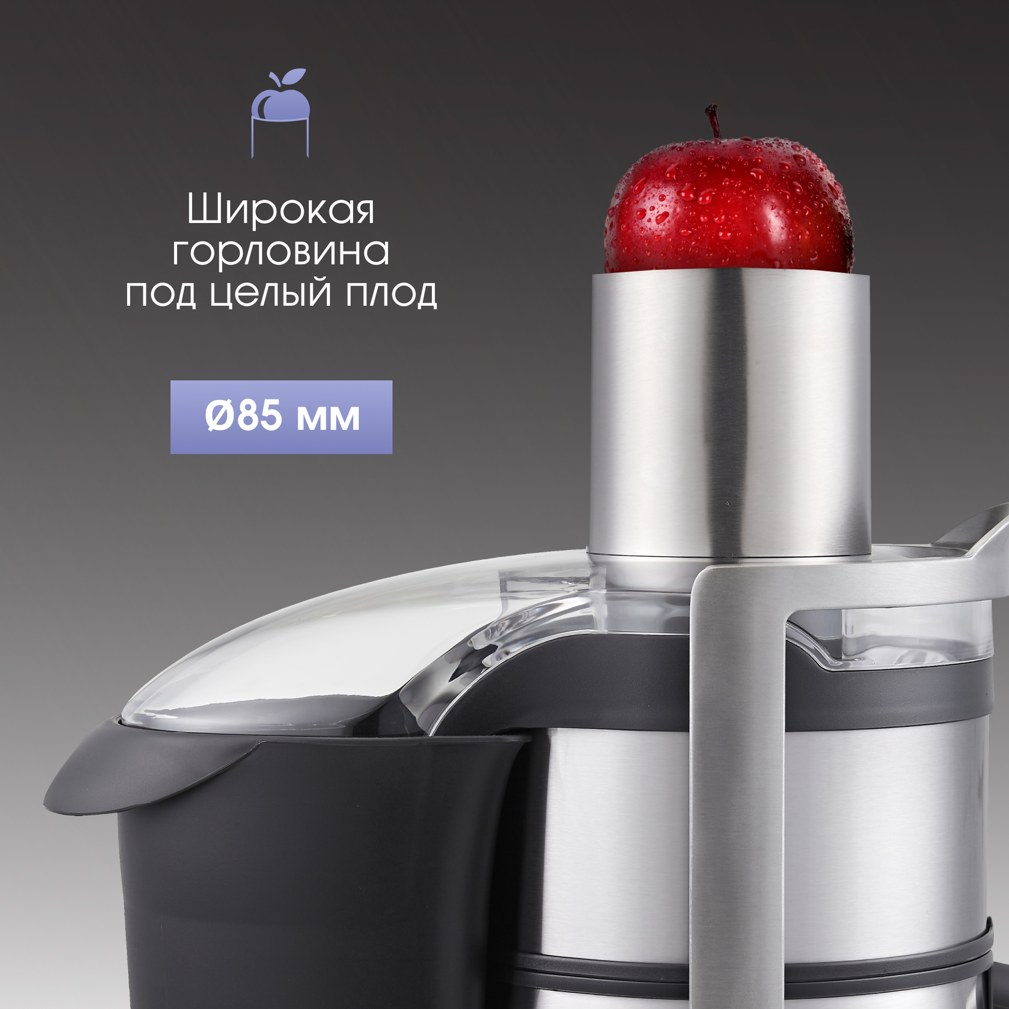 Большой диаметр загрузочного отверстия позволяет загружать плоды среднего размера целиком, что экономит силы и время при обработке продуктов, а мелкоячеистый фильтр из нержавеющей стали значительно увеличивает количество отжатого сока.