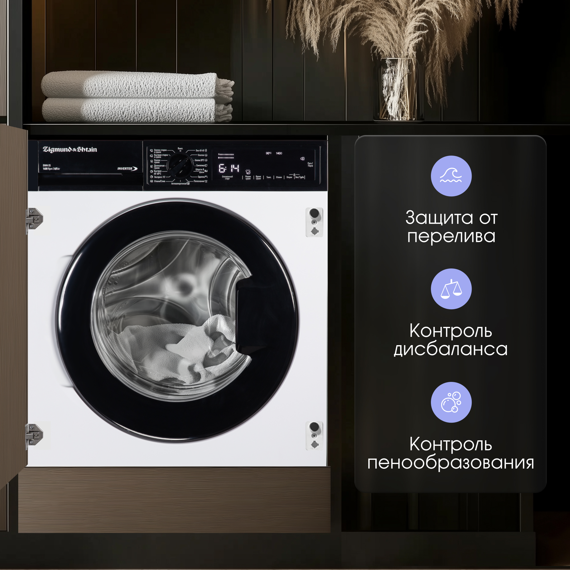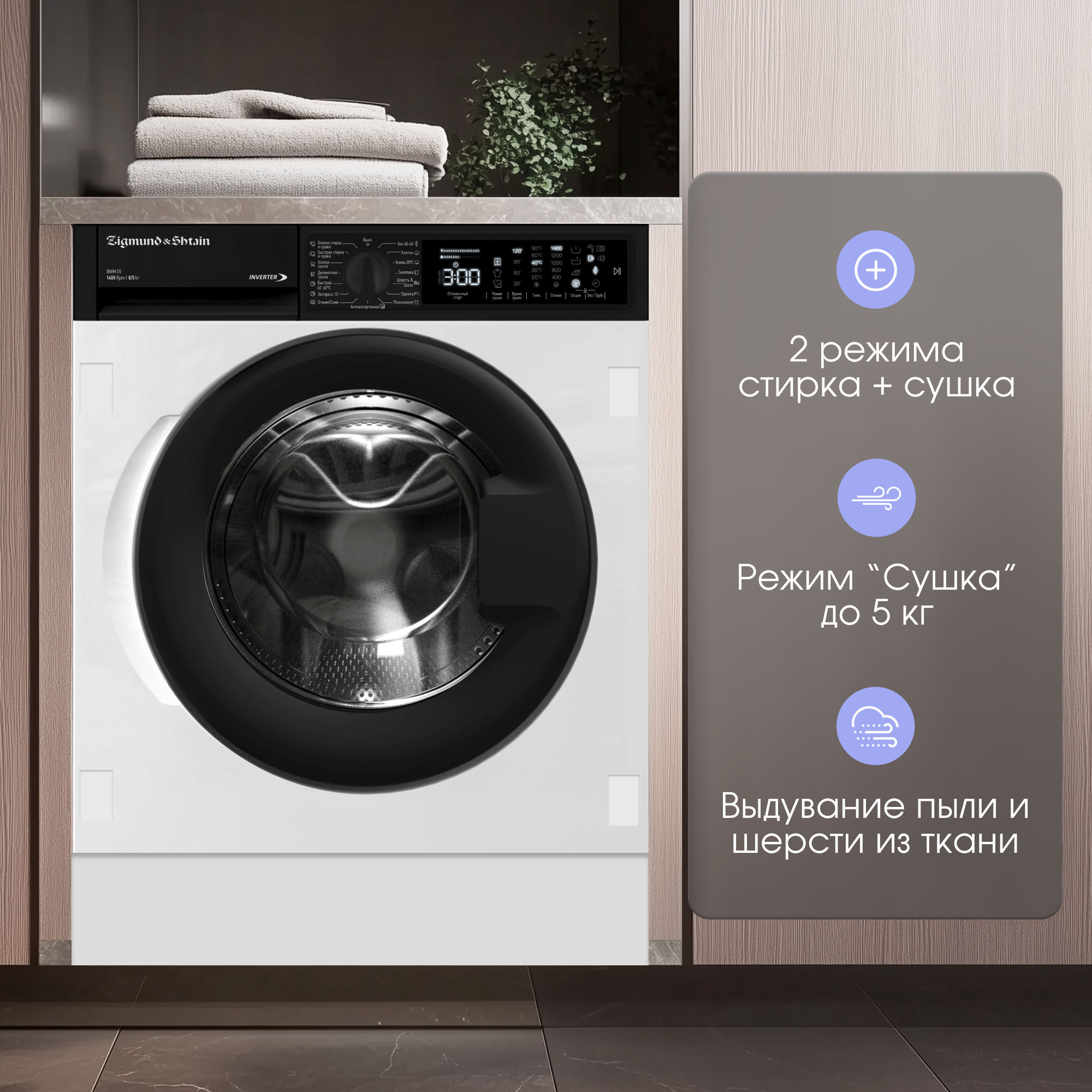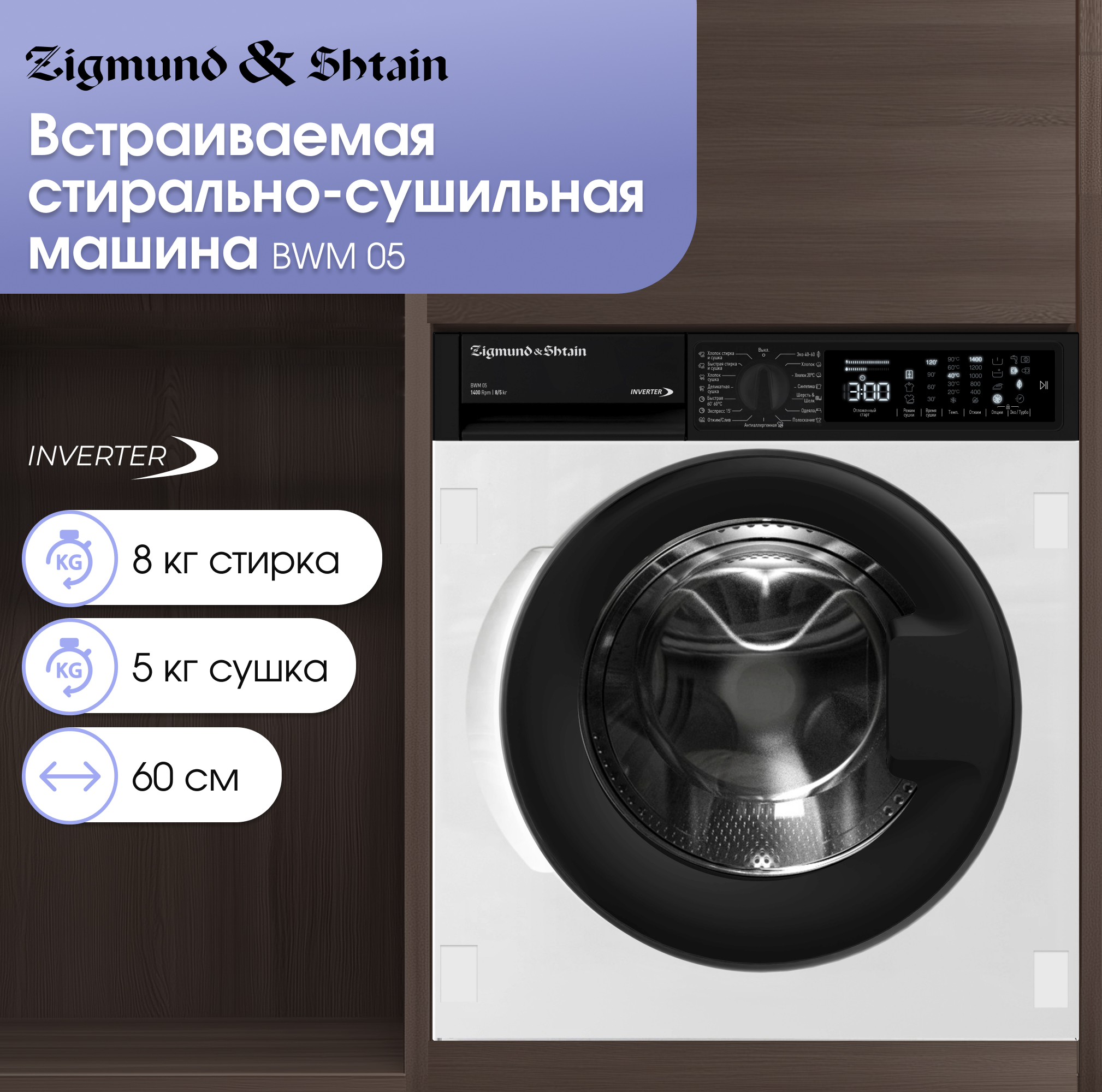 Встраиваемая стирально-сушильная машина Zigmund & Shtain BWM 05 с инверторным мотором и сенсорным управлением станет незаменимым помощником в доме благодаря надежной работе и широкому функционалу: быстро постирать и высушить вещи детей после прогулки, очистить постельное белье от пыли и грязи, удалить с одежды въевшиеся пятна больше не составит труда. Энергоэффективность, вместимость, набор функций, шум, дизайн и качество – все это может существенно повлиять на опыт использования стиральной машины, но модель Zigmund & Shtain BWM 05 отвечает критериям даже самых требовательных пользователей.