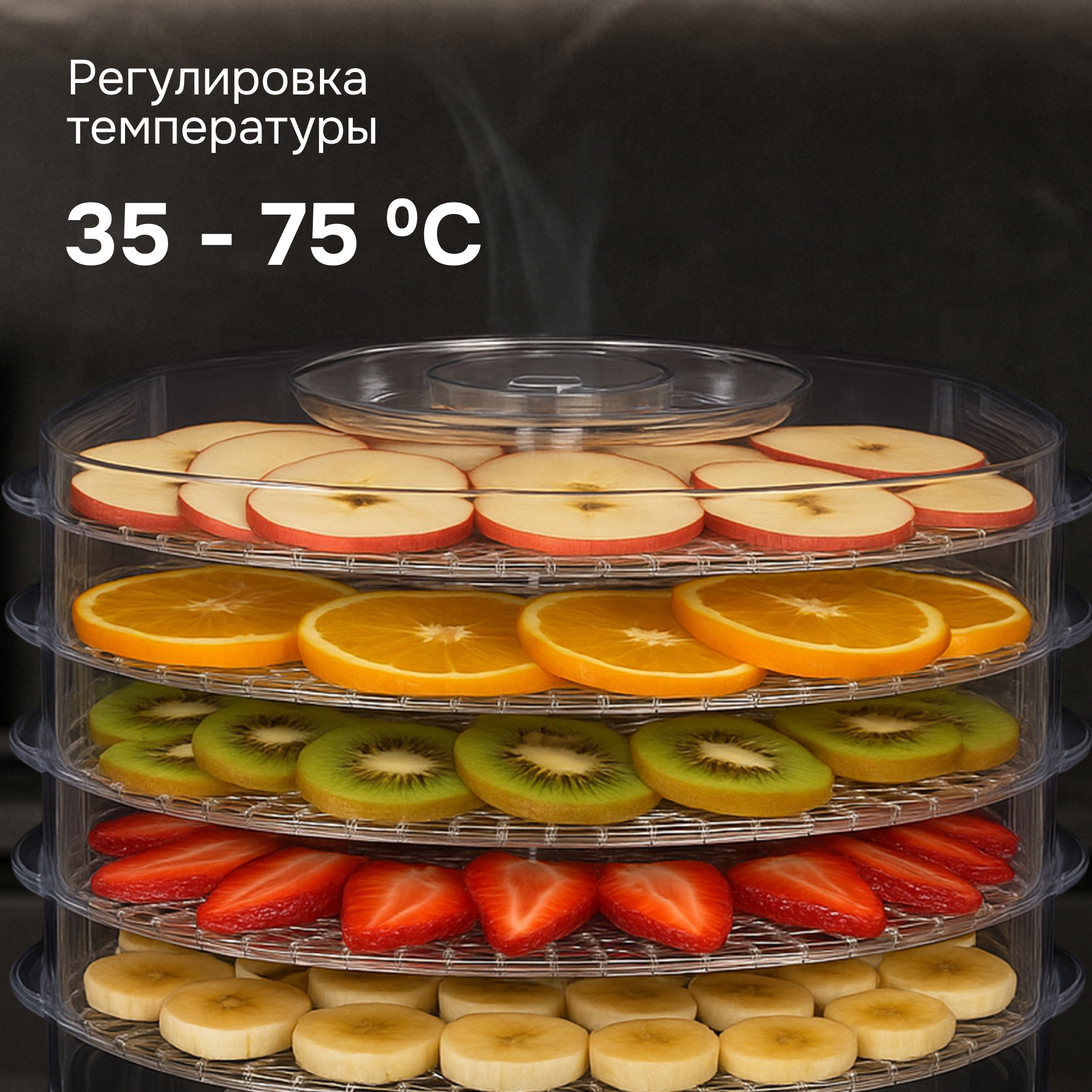 Сушилка — устройство конвекционного типа, предназначенное для сушки большого количества овощей и фруктов. Сушка производится горячим воздухом, равномерную циркуляцию которого обеспечивает вентилятор. Данный метод естественной дегидратации позволяет гораздо дольше хранить урожай и заготовки без вредных добавок и консервантов, сохранив все витамины и питательные вещества.