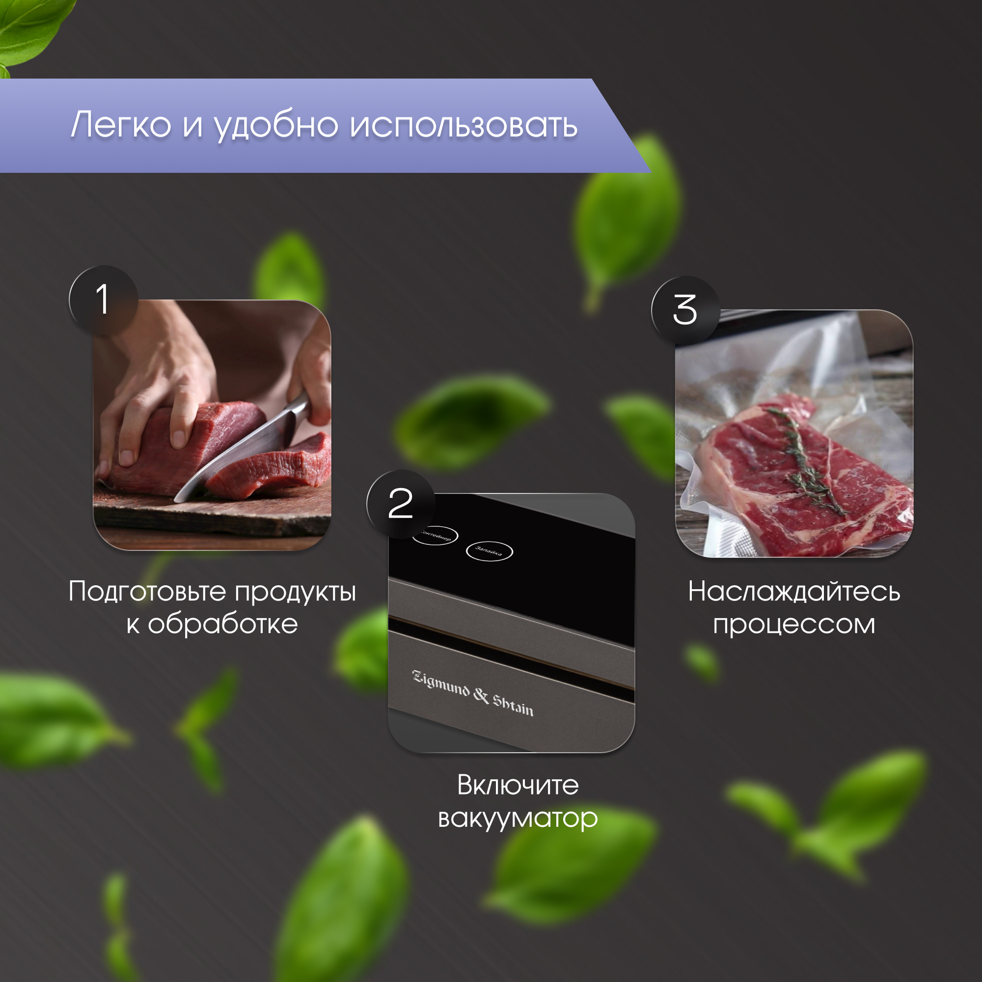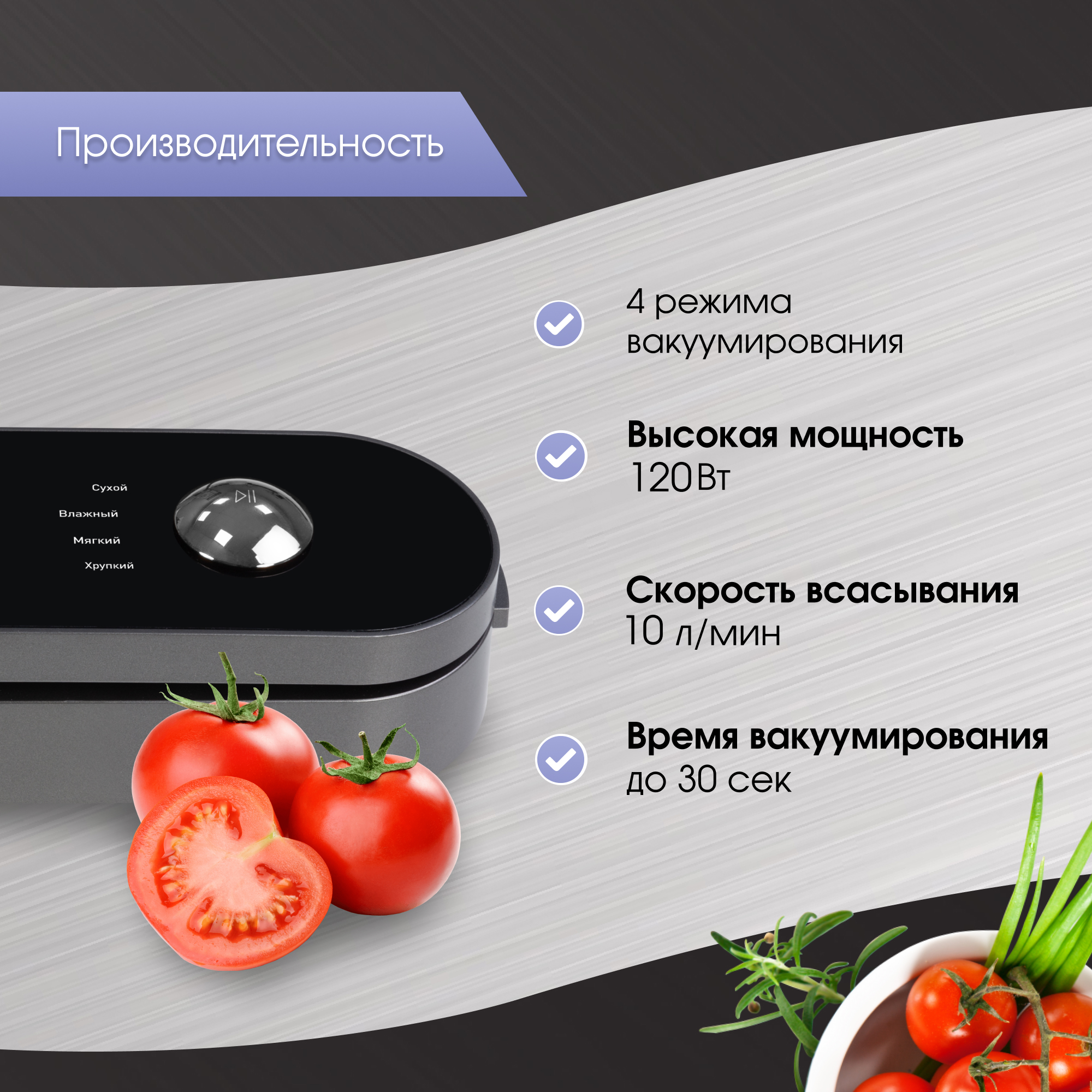 Вакууматор удаляет воздух из упаковки и герметично её запаковывает. Это устройство позволяет продлить срок хранения продуктов, исключить протекание влажных товаров или наоборот сохранить их сухими, экономить место в холодильнике и исключить смешивания запахов. Вакуумный упаковщик станет отличным помощником при приготовлении маринада или мяса методом Су-Вид.