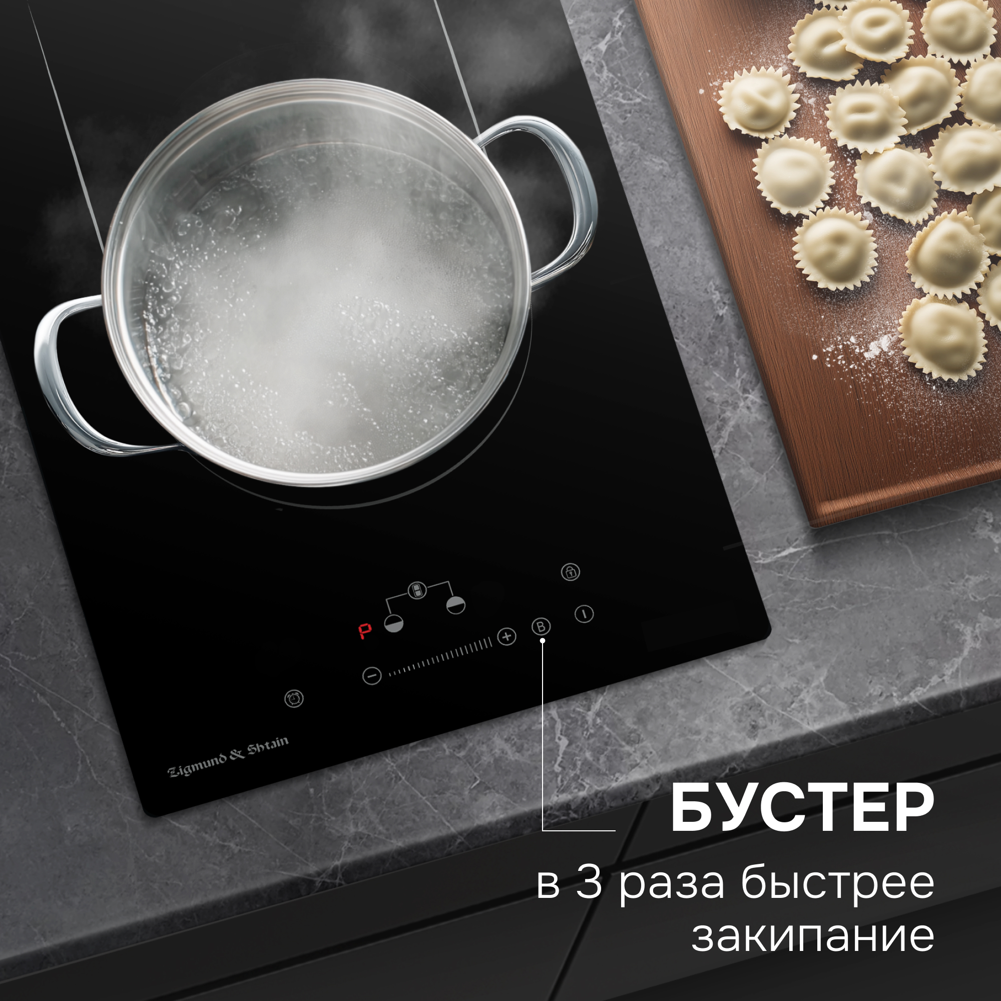 Панель автоматически реагирует на размер и площадь дна посуды, распределяя мощность нагревания.