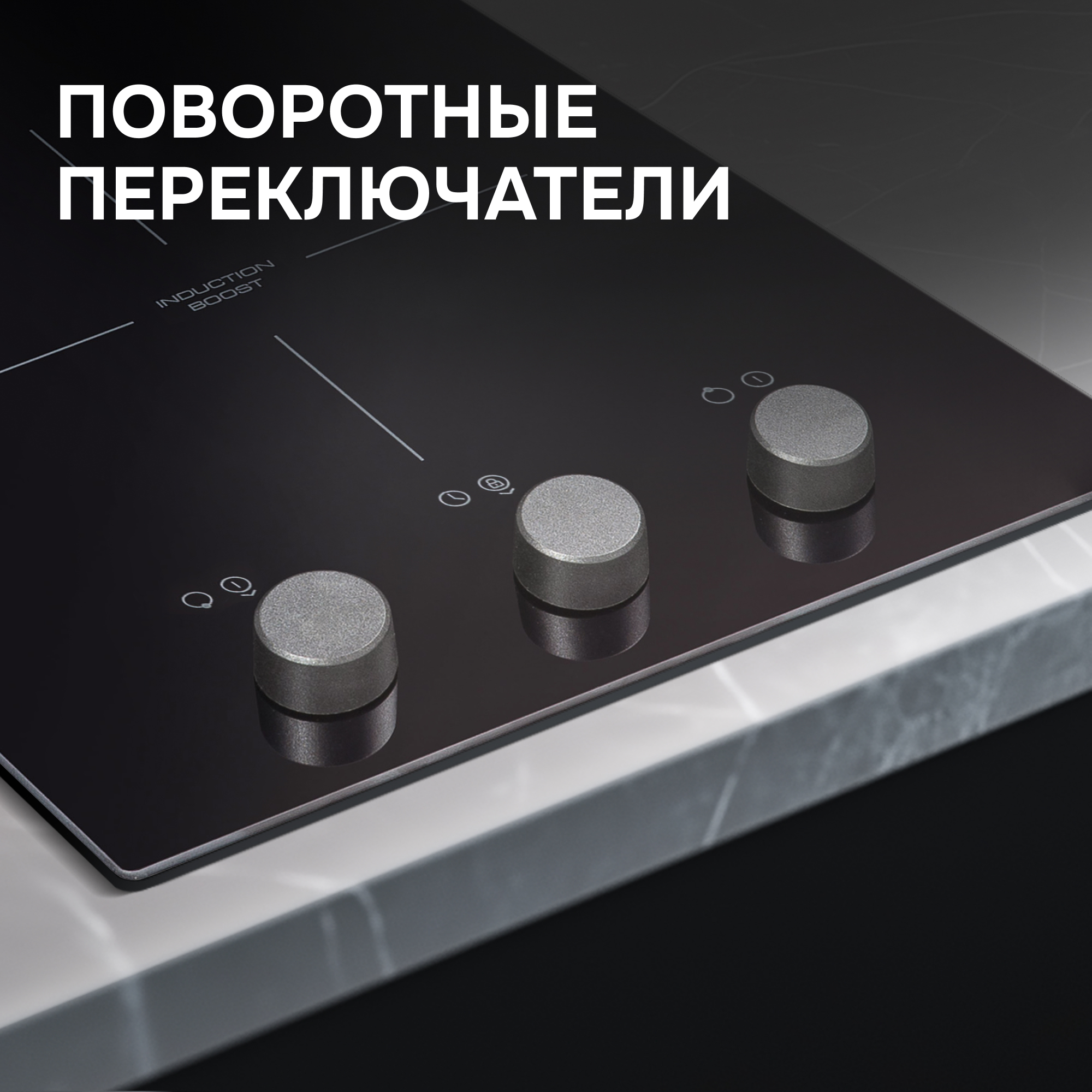 Управление варочной панелью осуществляется с помощью поворотных переключателей. Пользователь может выбрать один из 9 уровней нагрева, а функция бустера позволяет временно увеличить мощность каждой зоны для ускоренного нагрева.