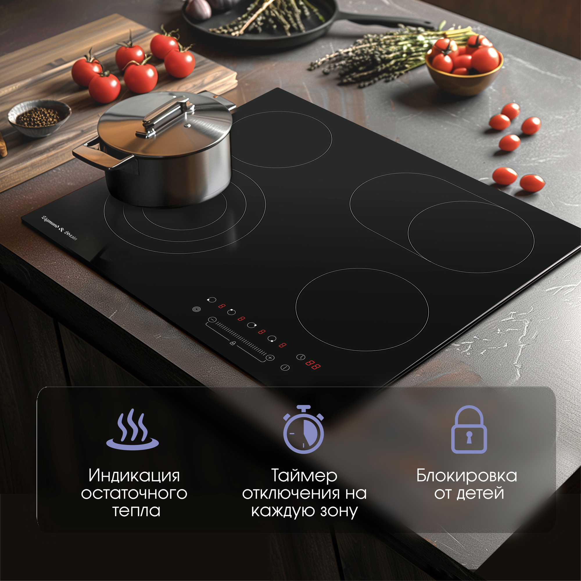 • Присутствует таймер отключения до 99 минут на каждую зону для автоматического контроля за процессом приготовления, например, при варке яиц и макарон;