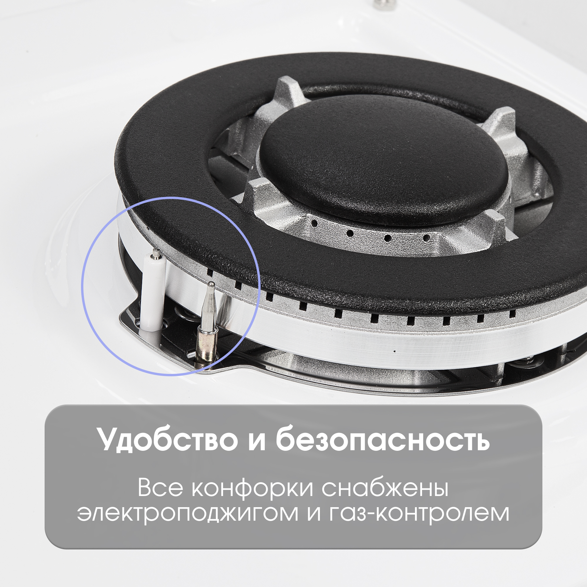 Электроподжиг избавит от необходимости поджигать конфорки спичками или зажигалками — достаточно просто нажать на ручки и повернуть для поджига конфорки;